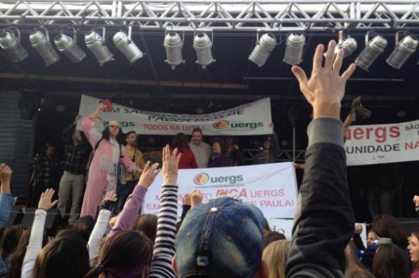 Estudantes da Uergs de São Francisco de Paula realizaram, na tarde de sábado (08), um abraço coletivo à unidade da instituição na cidade contra uma possível proposta de fechamento. Mais de 100 manifestantes promoveram ainda uma caminhada pela Avenida Julio de Castilhos e invadiram a Festa do Pinhão com cartazes e gritos de "Vive Uergs", "Fica Uergs" e "Cresce Uergs".